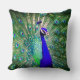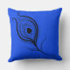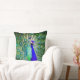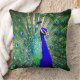 Throw pillow with image of peacock on front and silhouette of peacock feather on back. Background colours in deep blue.