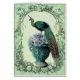 Pretty vintage card features a pastel green background of swirls and floral border with a Peacock perched on an urn of Hydrangea flowers. Card inside it matching soft green background.