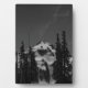 A black and white photograph of a mountain covered in snow. In the foreground the mountain is framed by tall trees. Shadows are cast on the mountain from stone ledges and from the few trees growing on the side of the mountain. Streaks of clouds rise up from behind the mountain reaching across the sky. Image Copyright ©2023 Kimberly J Tilley. zazzle.com/store/developingnature