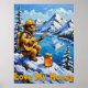 This imaginative artwork showcases a bear, a true "Peak Performer," with a firefighter helmet and sunglasses, captivatingly playing an acoustic guitar on a snow-covered mountain overlooking a pristine blue lake and towering, snow-capped mountains. Evergreen trees dot the snowy slopes. The vibrant, textured impasto creates a powerful and whimsical atmosphere, making this "Love My Honey" scene truly unforgettable.