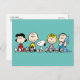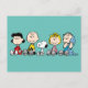 Check out Lucy, Charlie Brown, Snoopy, Sally, and Linus sitting together in a row.