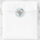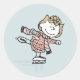 This circular Peanuts sticker features a charming winter scene set against a pale blue background. Sally Brown, Charlie Brown's younger sister, is gracefully figure skating in a classic pose. She is dressed warmly in a pink, polka-dotted skating dress, a striped pink and white scarf, matching mittens, and a bow in her hair. This officially licensed sticker is a delightful piece of winter-themed merchandise, perfect for fans who love the Peanuts characters, cold weather activities, or adding a nostalgic accent to notebooks and other belongings.