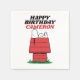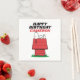 Complete your party tableware with this super cute, custom Peanuts birthday napkin! This square paper napkin features a clean white background and the iconic image of Snoopy happily relaxing atop his red doghouse. Above the cheerful beagle, the napkin displays a bold, festive "HAPPY BIRTHDAY" message highlighted in red, with space available for adding a custom name. This napkin is a perfect addition to the party table, offering a fun, vintage cartoon touch that can be easily personalized for the birthday child!