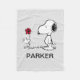 This is a personalized gray fleece blanket featuring a classic, black-and-white illustration of the beloved Peanuts characters, Snoopy and his friend Woodstock. Woodstock is depicted presenting a small, bright red flower to Snoopy, adding a pop of color to the otherwise monochrome drawing. The blanket is customized with a name printed boldly in black beneath the illustration. It is designed to be a soft, comforting, and personalized item perfect for a child.