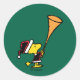 This vibrant, circular Peanuts sticker is set against a green background. The central image is of Woodstock, the little yellow bird, dressed as a festive caroler or elf. He's wearing a tiny red and black Santa hat and a matching miniature suit, and he is holding a large orange horn or trumpet to his mouth. This officially licensed sticker is a cute and lively piece of seasonal merchandise, perfect for celebrating the holidays, decorating gifts, or adding a charming musical accent to any surface.