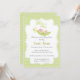 Baby shower invitation with peas in a pod design and green polkadot background.