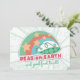 Super retro-cool peas on earth Christmas holiday card with peapod, rainbow, and decorative rays background for food vendors, chef or catering biz, and other cooking or culinary pros.