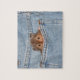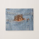 Long haired syrian hamster peeks out from the back pocket of denim blue jeans