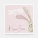 Cute peeking pink Easter rabbit with a white cloud on pink background.