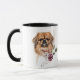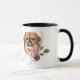 A portrait of a beautiful reddish brown Pekingese dog is just behind a pretty winter floral bouquet on this mug. Behind the image is a swirl of faux gold glitter. The image is printed twice on the mug, with your custom name or other text between them.