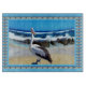Pictured at the beach with waves splashing on rocks is a pelican and bordered with the same image
