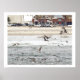 Very wonderful, and cute Photograph digitally painted, of Pelicans diving, and flying. A California beach town boardwalk in the background. See as large poster or print, or resize smaller.