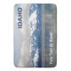 Looking east from Sandpoint, ID across Lake Pend Oreille (pond uh-ray) on a winter day; snow-covered mountains in the distance. Ice has formed at the shore and extends part way across the lake. Blues and greys are the predominate colours. Text reading "IDAHO" also appears. And their is a place to add additional text.