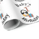 An adorable black and white penguin sits in front of a cupcake with a candle and a present wrapped in plaid wrapping paper with a bow. The picture is surrounded by the words "Baby's 1st Birthday". Baby's and birthday are in black and 1st is in a plaid that contains red, yellow and blue on wrapping paper.