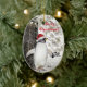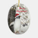 A cute penguin wearing a Santa's hat standing under a snowy tree.
