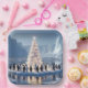 Penguins gather around a glowing white Christmas tree on a floating ice platform in a serene, icy landscape