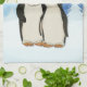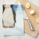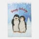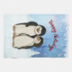 Adorable Penguin couple on snow covered ground with pine tree forest and blue sky in the background. Text art typography above says Happy Holidays. Customise text area below or delete if not wanted.