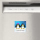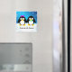 Two cute black and white penguins holding hands on a winter snowy day. A template below the penguins to add your names.