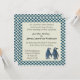 A cute wedding invitation that features a penguin couple holding hands. A blue and white checked border surrounds the invitation. Great for a whimsical couple.