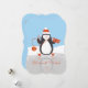 Cute penguin wearing a winter hat, sitting on the ice with crochet hook and ball of yarn on this Christmas card for gifting your list with crocheted projects.