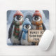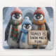 Three adorable penguins are bundled up in colourful hats and scarves, standing in front of an igloo while holding a sign that reads, "Family is snow much fun."