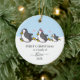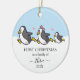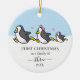 First Christmas as a family of 3 Christmas ornament with a penguin illustration and snow in the background. Great gift for new parents this Holiday season. Double-sided with the same design.