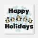 Christmas T-shirts, mugs, cards, stickers, tote bags, magnets, and other Christmas holiday clothing and gift items featuring five adorable penguins and text that reads Happy Holidays.