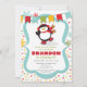 Lace up those skates, it's time to celebrate a birthday with this adorable penguin invitation. This invite features cute winter penguin with colourful bunting banner, snowflakes, and spotted background.
