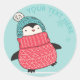 These round stickers are perfect for sealing up your Christmas cards or holiday party invites. They feature a cute illustration of a penguin bundled up in a hat and sweater against a mint green background. Use the template field to add your own name or greeting to these stickers.