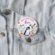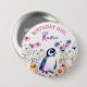 A cute penguin surrounded by pink, blue, orange and purple flowers watercolor illustration girl's birthday party personalised birthday girl button.