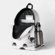 Backpack with a very cute penguin design, white with a pattern of penguin faces. The penguins are in classic colors of white, black, and orange, with happy expressions. Front zippered pocket and black top handle for easy carrying. On the side of the backpack, there is a mesh pocket for holding water bottles. Perfect backpack for school or hiking, thanks to its cheerful and functional design!