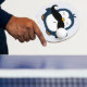 A cute blue chubby penguin with a huge black trendy mustache with a blue background.