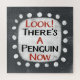 An irreverently weird typographic animal design that says "Look! There's A Penguin Now". It features black and red text on a white rectangle with funky, playful white dots surrounding it, all on a grey background.