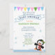 Cute penguin baby shower invitation.. Colourful background. Penguin has a green hair bow and is standing on an iceberg. Kristi W/Graphic's n Bits.