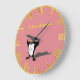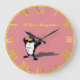 A black and white Penguin . With a pink back ground and a gold trim around the outside and golden numbers with a place for your text for your personal name on this clock.