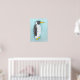 A Cute penguin with whimsical trim and pink dots looks on, over a blue icy background.