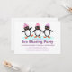 Three cute penguins in woollen caps of pretty purple and pink are slip sliding around in this bright and happy ice skating themed birthday party invitation.