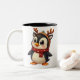 A vintage cute cartoon playful little baby pesto penguin wearing reindeer costume, kawaii. Big anime eyes. The background is solid white