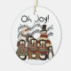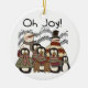 Two snowmen and five penguins sing holiday carols and text reads "Oh Joy!" on keepsake holiday ornaments.