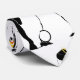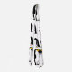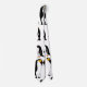 A black and white pattern of penguins. Birds show in their appropriate scale against each other. They are King Penguins, emperor penguins, little penguins, macaroni penguins, crested penguins, South African penguins and others.