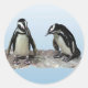 This sticker features two adorable African Penguins standing on a rocky ledge. They are aquatic, flightless birds whose wings have become flippers. Each has a black stripe and black spots on the chest. The pattern of spots is unique for every penguin, just like human fingerprints. They have pink glands above their eyes and pink and black feet.