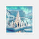 Penguins gather around a beautifully decorated white Christmas tree on an icy floe and the Northern Lights ethereal glow illuminates the snowy landscape
