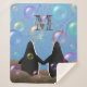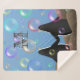 This cute penguin sherpa fleece blanket features two penguin friends holding flippers while observing a colourful rainbow of bubbles floating all around them against a clear blue sky - the penguins are standing amongst large brown boulders - customise with name and monogram - by katz_d_zynes