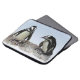 This laptop sleeve features two adorable African Penguins standing on a rocky ledge. They are aquatic, flightless birds whose wings have become flippers. Each has a black stripe and black spots on the chest. The pattern of spots is unique for every penguin, just like human fingerprints. They have pink glands above their eyes and pink and black feet.