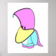 A pastel cartoon wizard penguin with a light blue and white body, lavender feet, light yellow beak, and tiny black eyes, wearing a stylish lavender cape and hood with a light blue raindrop-shaped jewel at the end, carrying a lavender and light yellow magic star wand.