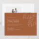 This exquisite invitation captures the essence of your special day with its clean lines, sophisticated typography, and subtle tropical leaf sketches. The rich bronze or burnt orange hue sets the tone for a warm and inviting celebration.