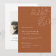This exquisite invitation captures the essence of your special day with its clean lines, sophisticated typography, and subtle tropical leaf sketches. The rich bronze or burnt orange hue sets the tone for a warm and inviting celebration.