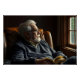 Photorealistic portrait of an elderly man with white hair and beard, wearing glasses, seated alone in a deep brown leather armchair. He gazes wistfully out a nearby window, illuminated by soft natural light, with dust motes visible in the air. The surrounding cozy, traditional room is dimly lit, creating a quiet, contemplative, and melancholic atmosphere. A closed book rests nearby, emphasizing solitude and reflective stillness. Focus is on his thoughtful expression and the serene emptiness around him.