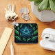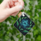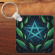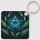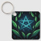 This whimsical keychain features a vibrant green pentagram surrounded by leaves and a cosmic sky finished as an oil paint print.