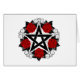 Black pentagram with pattern, decorated with blooming, red roses with leaves on white background. Tattoo style.